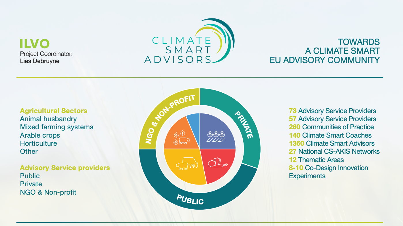 ClimateSmartAdvisors è una rete multiattore paneuropea che copre 27 Paesi. L’obiettivo del progetto è quello di rafforzare la rete dei consulenti agricoli dell’UE, accelerando l’adozione di pratiche agricole intelligenti dal punto di vista climatico (Climate Smart – CS) da parte di tutti gli attori afferenti ai sistemi agricoli e tra gli AKIS dell’UE. Per raggiungere questo obiettivo, ClimateSmartAdvisors si concentra sul ruolo cruciale dei consulenti nello sviluppo e nella diffusione delle innovazioni e delle pratiche di CS. Il progetto organizzerà attività incentrate sul rafforzamento della capacità dei consulenti di fornire supporto in materia di CS e sul potenziamento del loro ruolo nella transizione verso l’agricoltura CS attraverso il loro coinvolgimento in progetti di innovazione, CS-AKIS e progetti e iniziative dell’UE.